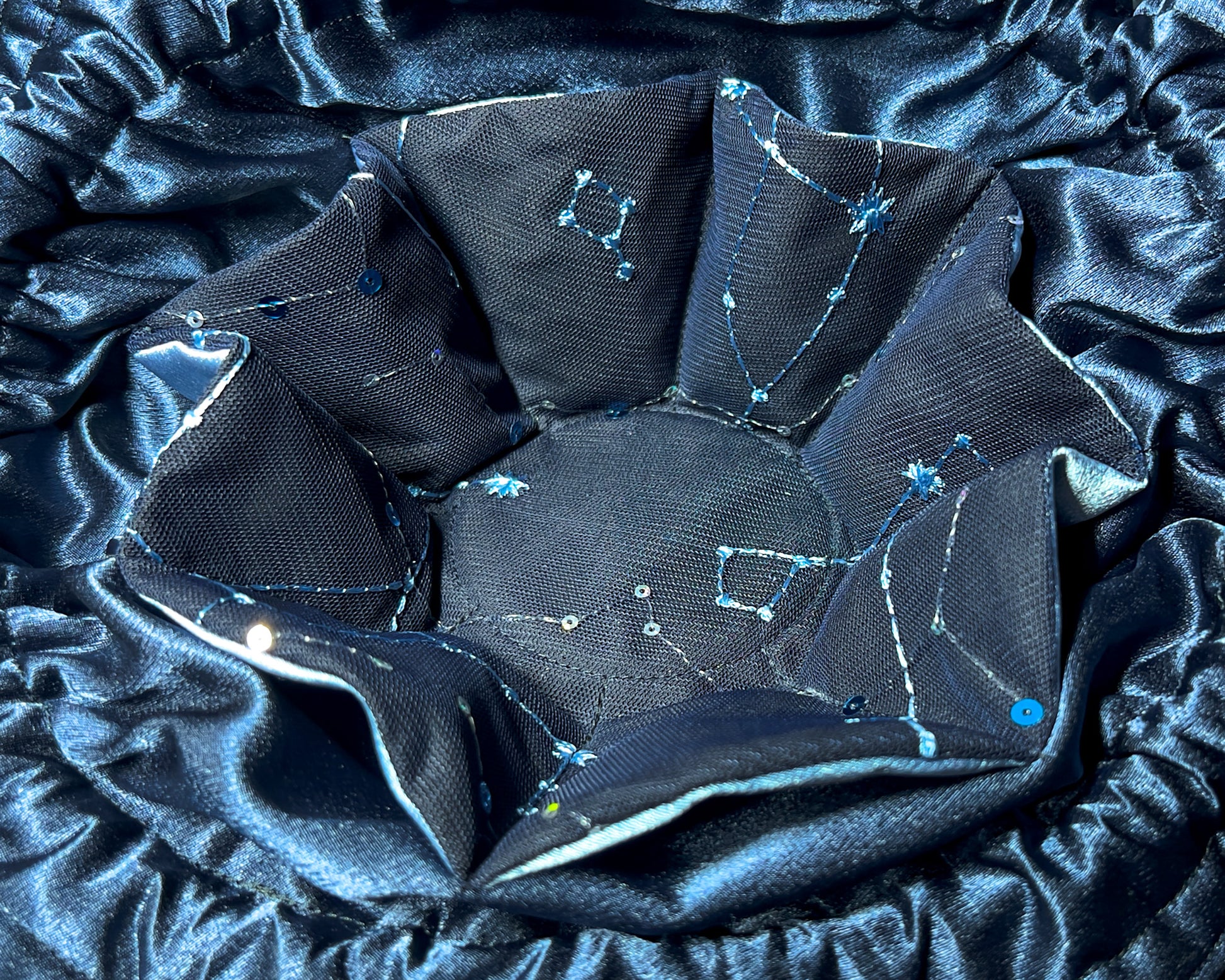 - FABRIC - Exterior: blue plush fleece with gold foil celestial print. Interior: navy satin. Pockets: black mesh embroidered with sequin constellations outside with pale blue satin inside.