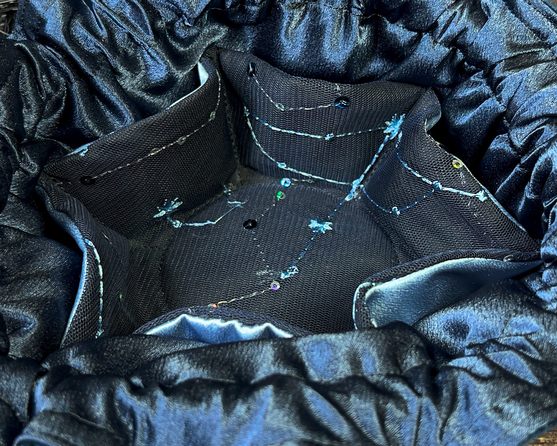 - FABRIC - Exterior: blue plush fleece with gold foil celestial print. Interior: navy satin. Pockets: black mesh embroidered with sequin constellations outside with pale blue satin inside.