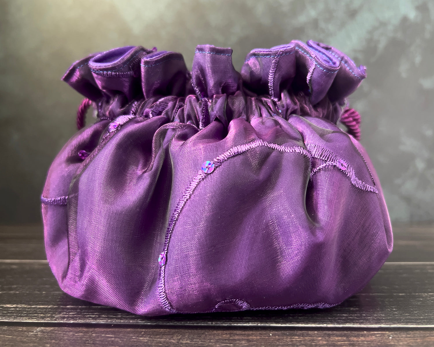 A spell is cast with our Charm Person Bag and you just might have fallen under it. On the exterior of the bag, sequined organza floats above a layer of purple cotton like a freshly cast enchantment. Inside the bag, the purple satin lining balances out the shimmering metallic mesh pockets while the spell knits tighter. Finally, a bit of purple mischief magic is condensed into the semi-precious stone beads on the drawstring cords alongside a few golden baubles to help distract and delight.