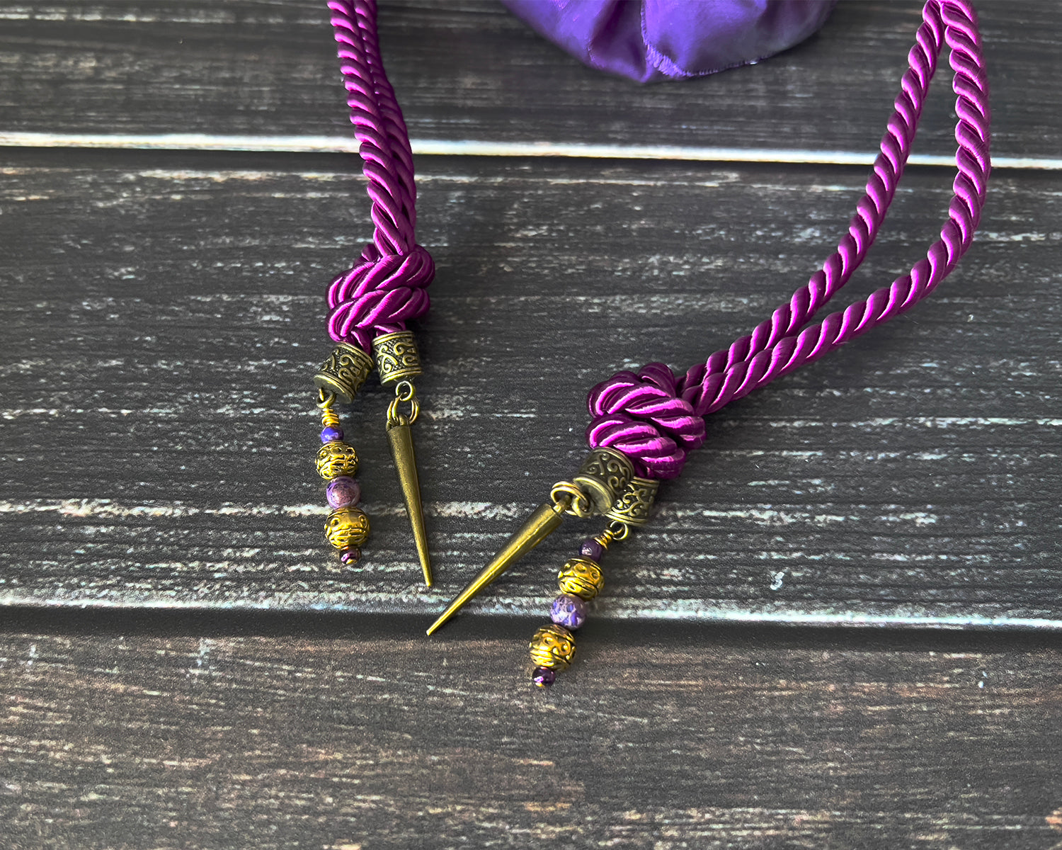 - ACCENT CHARMS - Purple semi-precious stone and metal beads. Bronze spike charms.