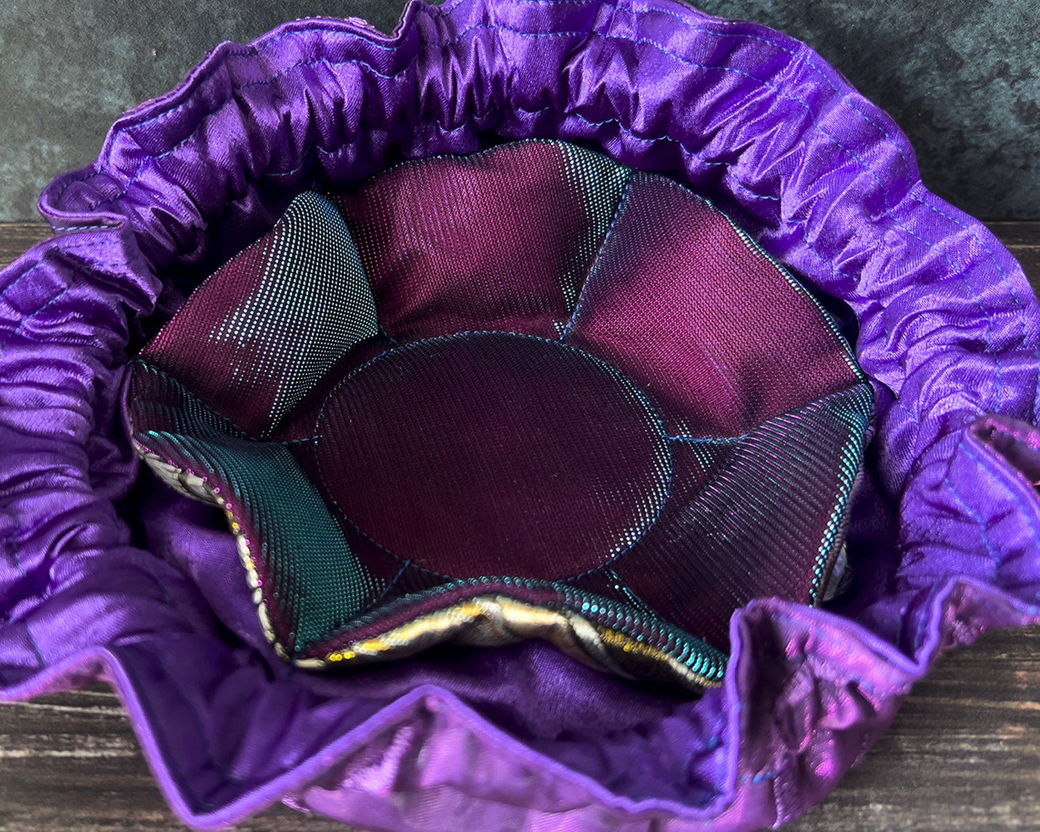 Designed with segmented interior pockets and a wide mouth opening, our bags are ideal for holding table-top gaming dice (for Dungeons and Dragons, Pathfinder, etc.) or as bags for jewelry, crystals, coins and more. The double drawstring cord closure holds the bag secure when closed. When open, internal reinforcements in the construction process help the bag to keep its shape. An additional flexible insert sewn into the base of the bag also helps it to sit flat on a table and can double as a dice rolling surface.