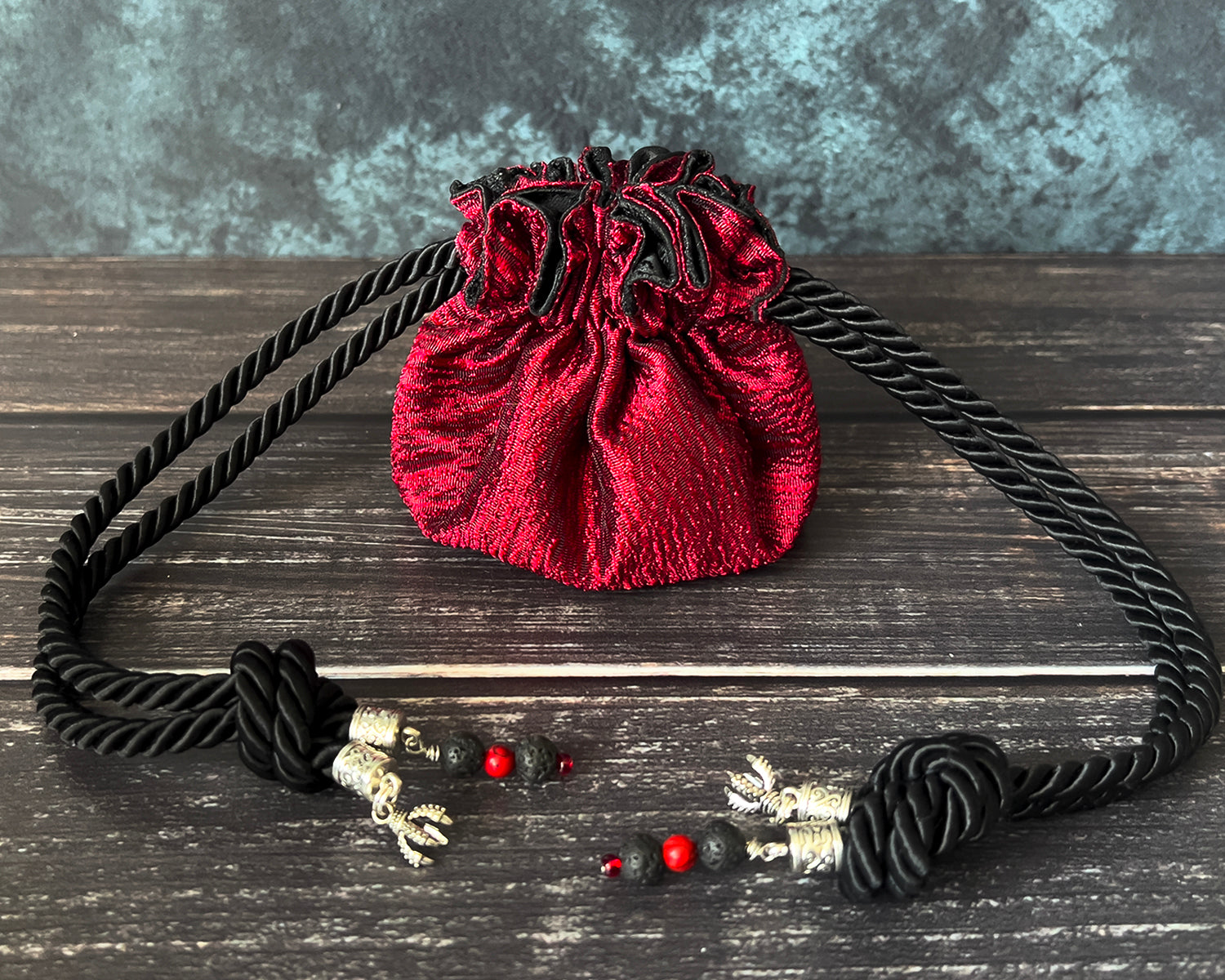 The thrill of the hunt pulses through the Crimson Hunter Bag and the vibrance of its red exterior. The black lining fabric is mottled with the texture of a previous quarry and the pattern of the pockets are struck through with black and silver like the drag of sharp claws. Those same claws might now serve as charms on the ends of the drawstring cords alongside black lava beads forged by some beasts fiery breath.