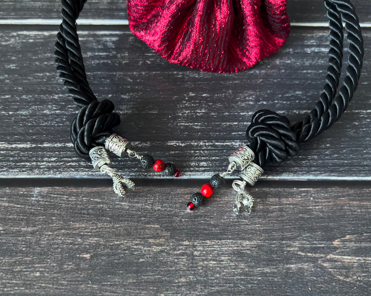 The thrill of the hunt pulses through the Crimson Hunter Bag and the vibrance of its red exterior. The black lining fabric is mottled with the texture of a previous quarry and the pattern of the pockets are struck through with black and silver like the drag of sharp claws. Those same claws might now serve as charms on the ends of the drawstring cords alongside black lava beads forged by some beasts fiery breath.