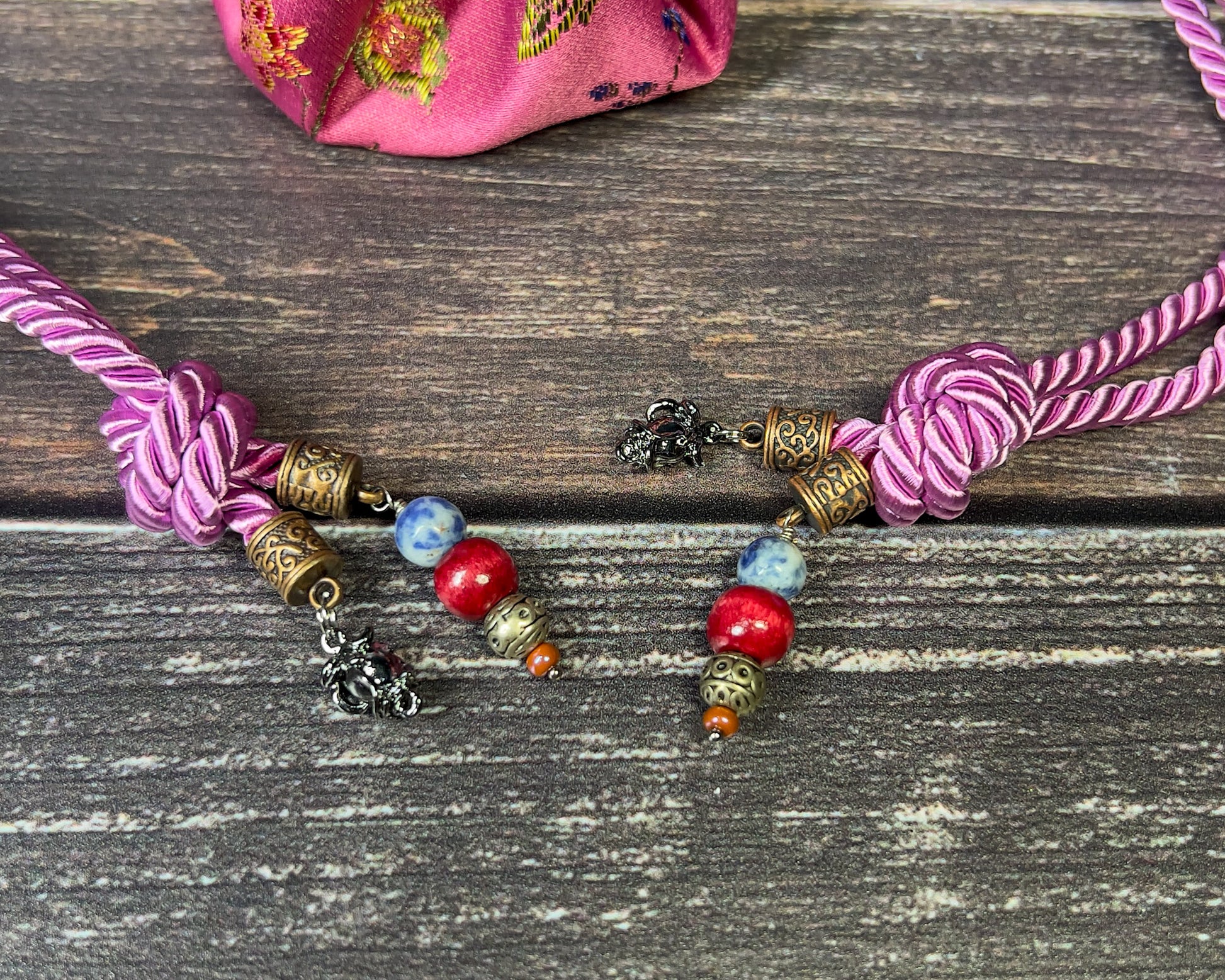 - ACCENT CHARMS - gunmetal rosebud charms, wooden red beads, blue semi-precious stone beads.