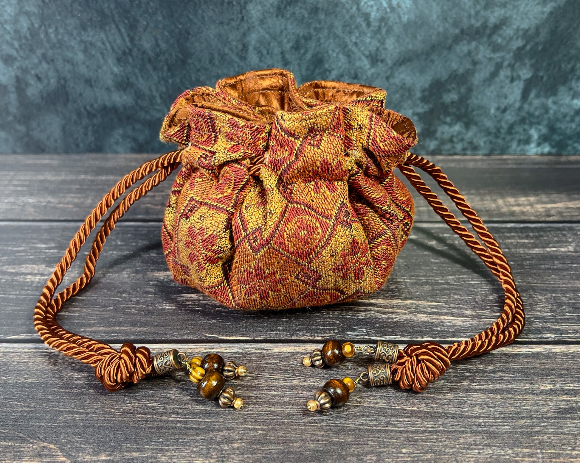 Designed with segmented interior pockets and a wide mouth opening, our bags are ideal for holding table-top gaming dice (for Dungeons and Dragons, Pathfinder, etc.) or as bags for jewelry, crystals, coins and more. The double drawstring cord closure holds the bag secure when closed. When open, internal reinforcements in the construction process help the bag to keep its shape. An additional flexible insert sewn into the base of the bag also helps it to sit flat on a table and can double as a dice rolling surface.