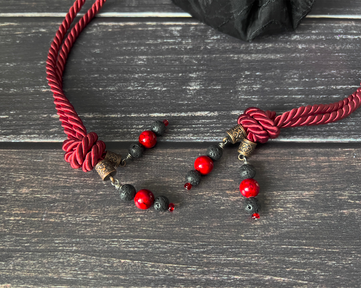 - ACCENT CHARMS - Red semi-precious stone and black lava beads.