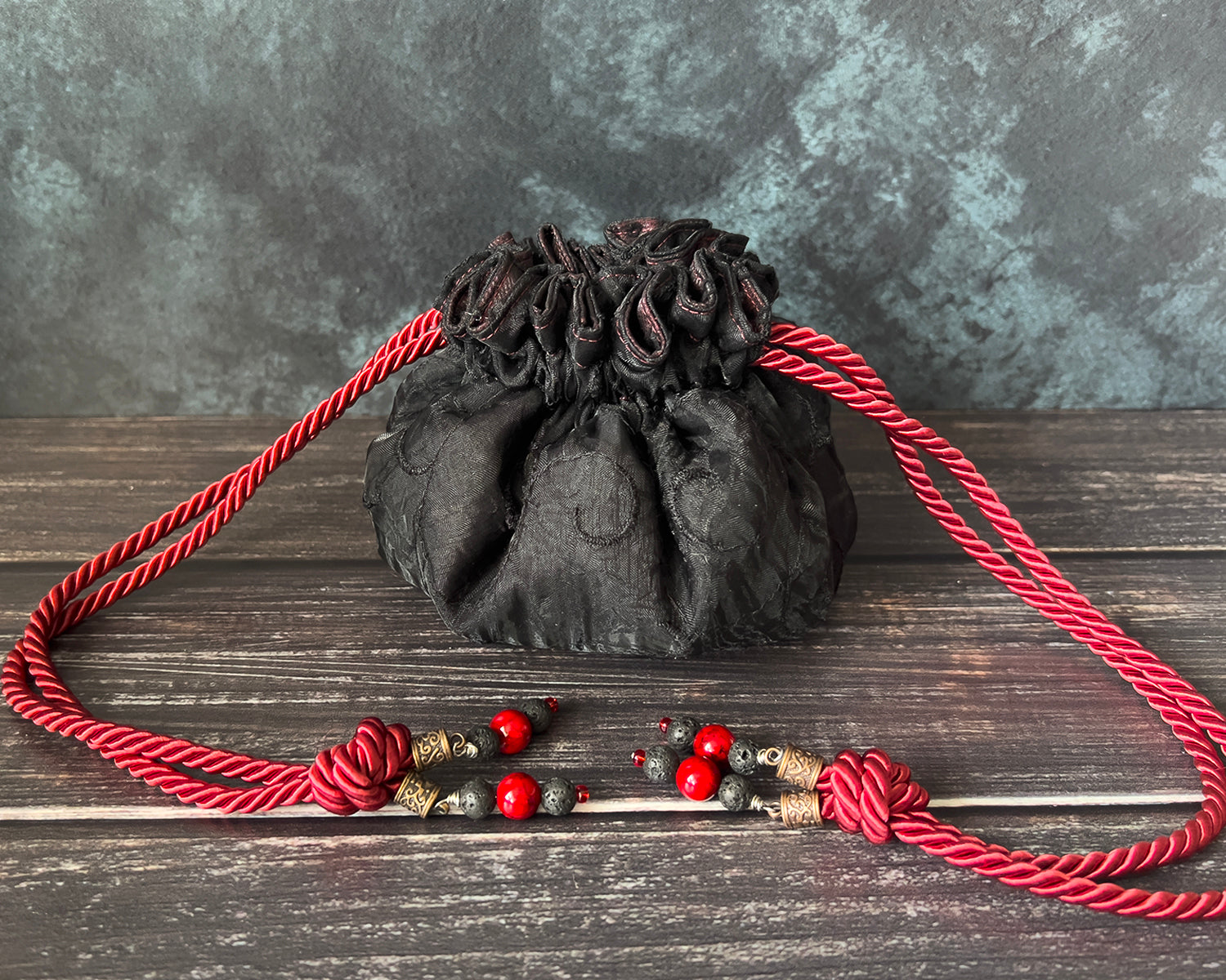 Designed with segmented interior pockets and a wide mouth opening, our bags are ideal for holding table-top gaming dice (for Dungeons and Dragons, Pathfinder, etc.) or as bags for jewelry, crystals, coins and more. The double drawstring cord closure holds the bag secure when closed. When open, internal reinforcements in the construction process help the bag to keep its shape. An additional flexible insert sewn into the base of the bag also helps it to sit flat on a table and can double as a dice rolling surface.