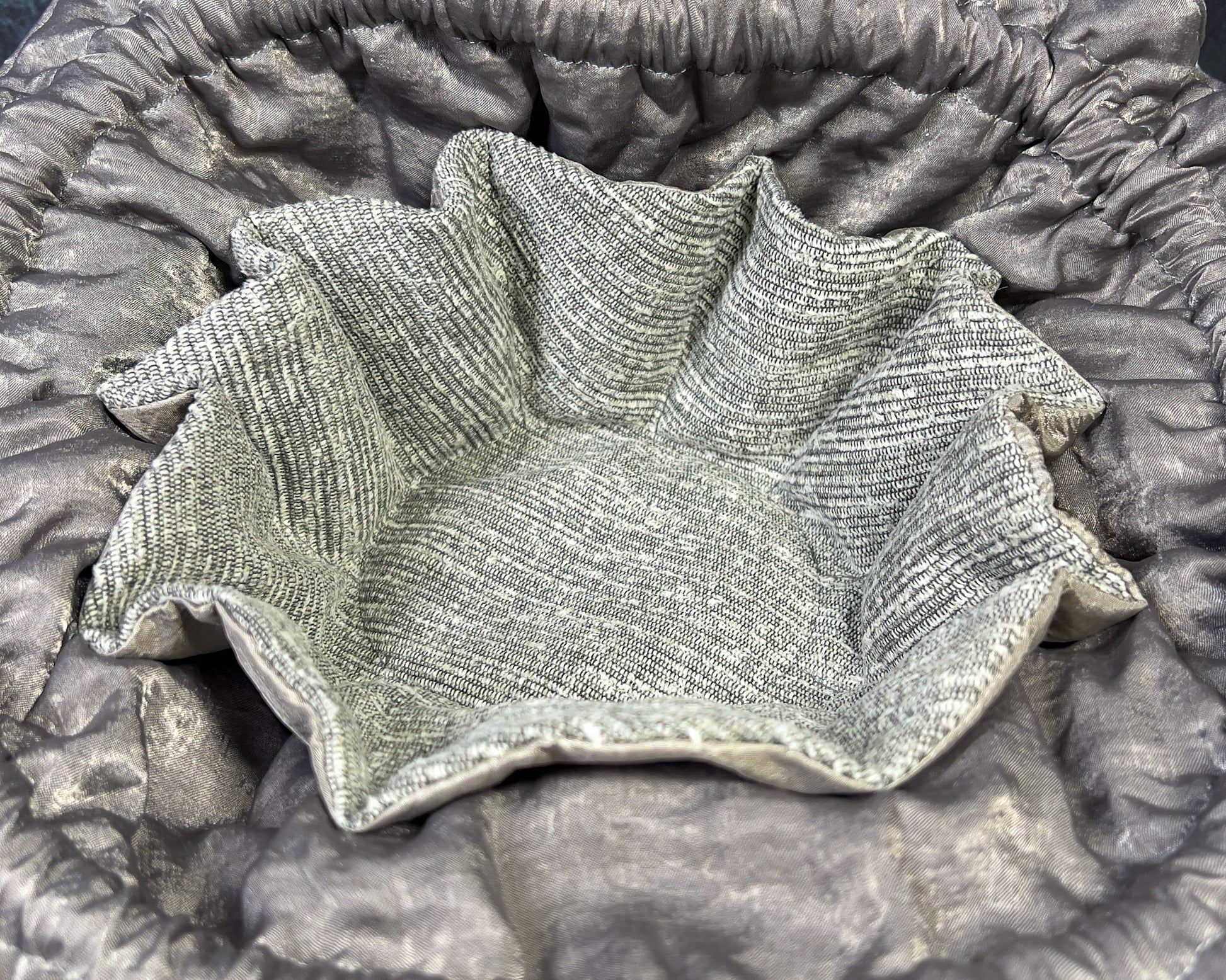 - FABRIC - Exterior: Silver flecked micro-suede. Interior: iridescent silver sateen. Pockets: rough spun grey weave outside with light grey satin inside.