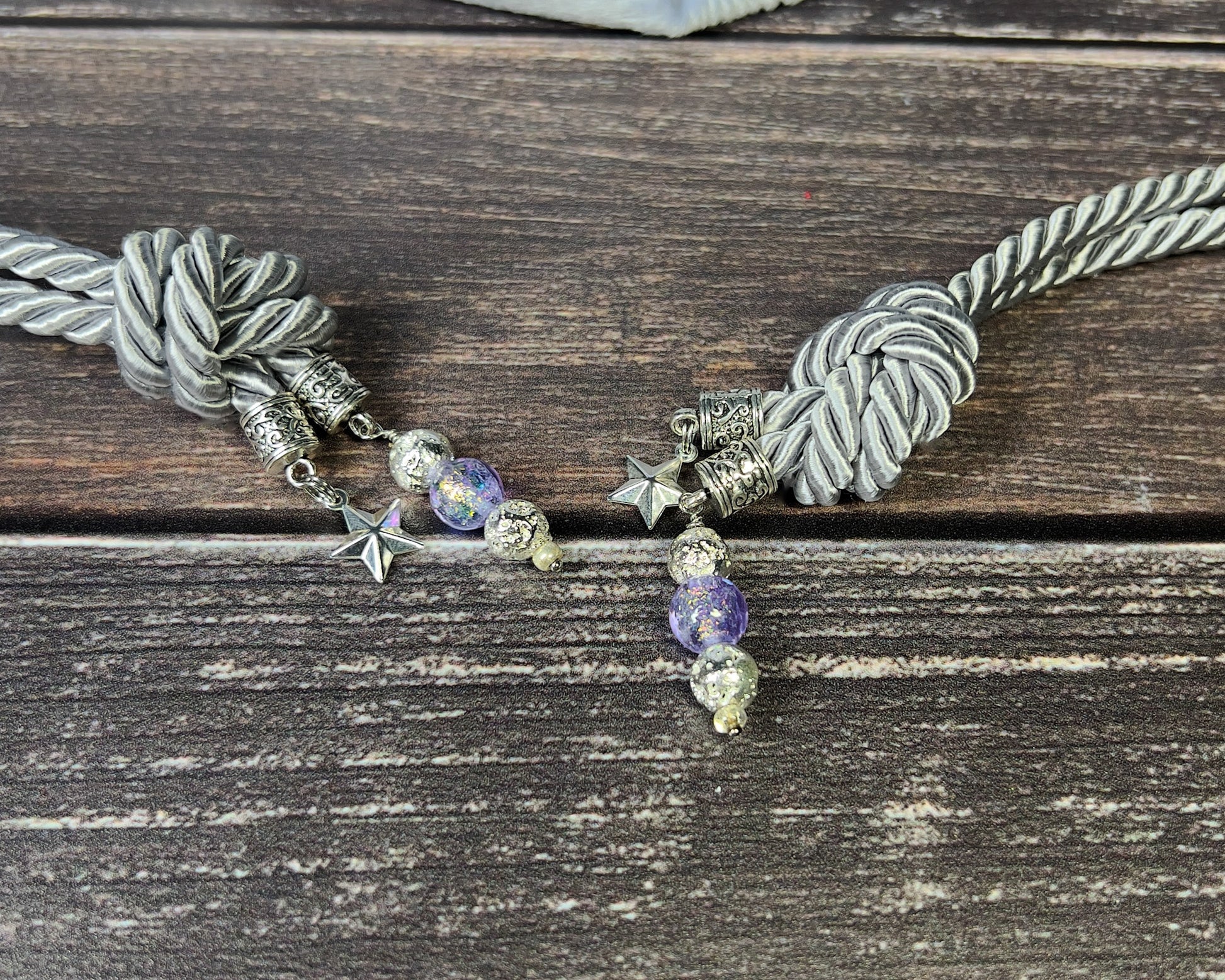 - ACCENT CHARMS - silver star charms, silver lava beads and purple crackle glass beads.