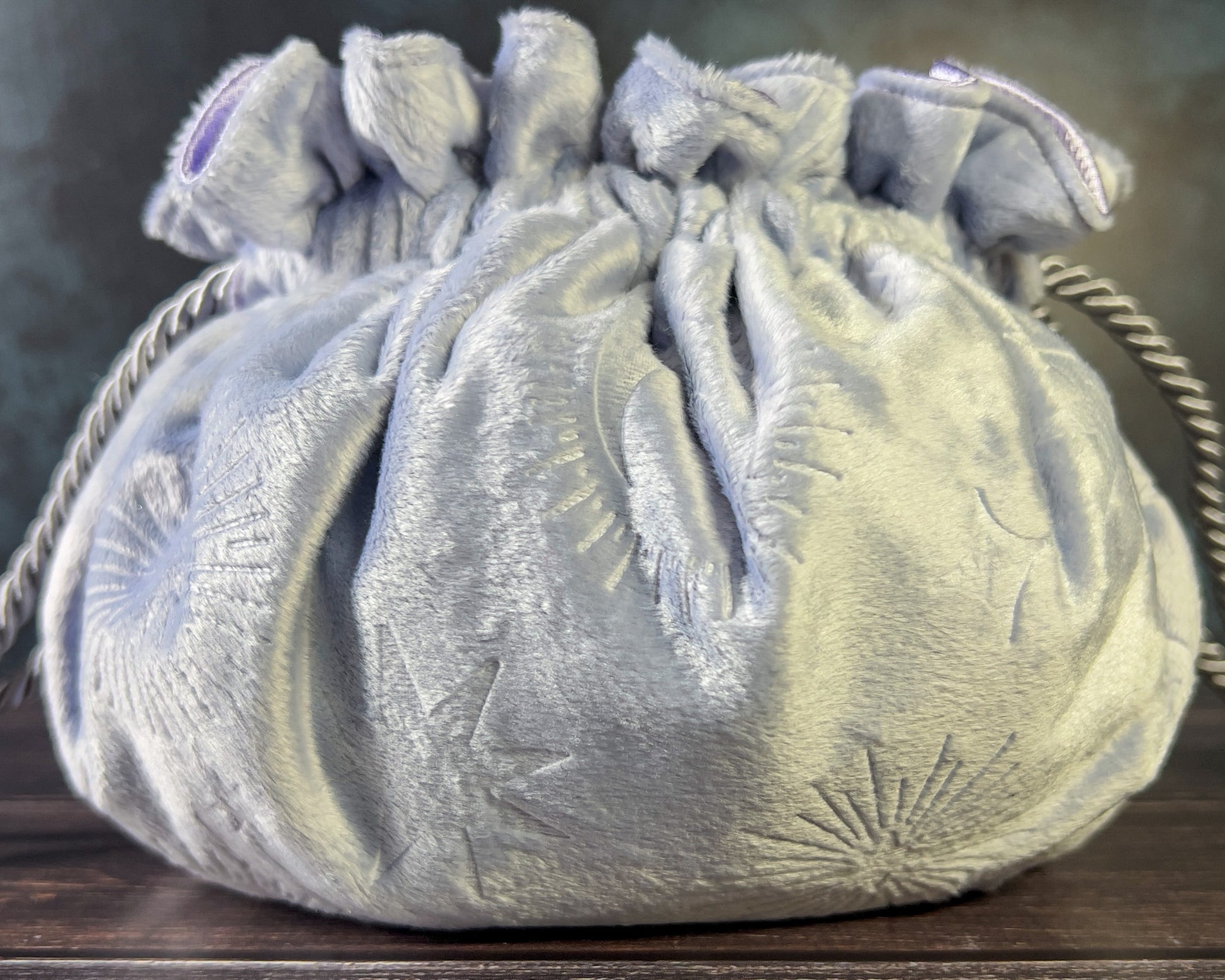 - FABRIC - Exterior: pale purple micro-fleece with moon and star pattern. Interior: pale purple crushed satin. Pockets: textured purple foil organza outside with silver satin inside.