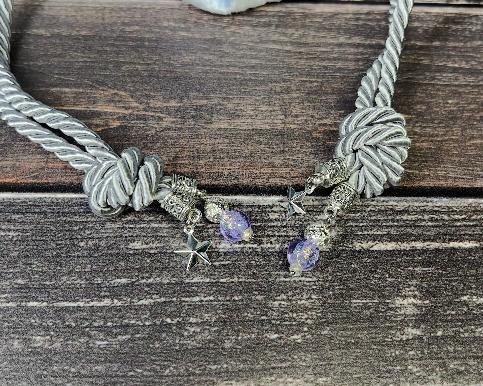 - ACCENT CHARMS - silver star charms, silver lava beads and purple crackle glass beads.