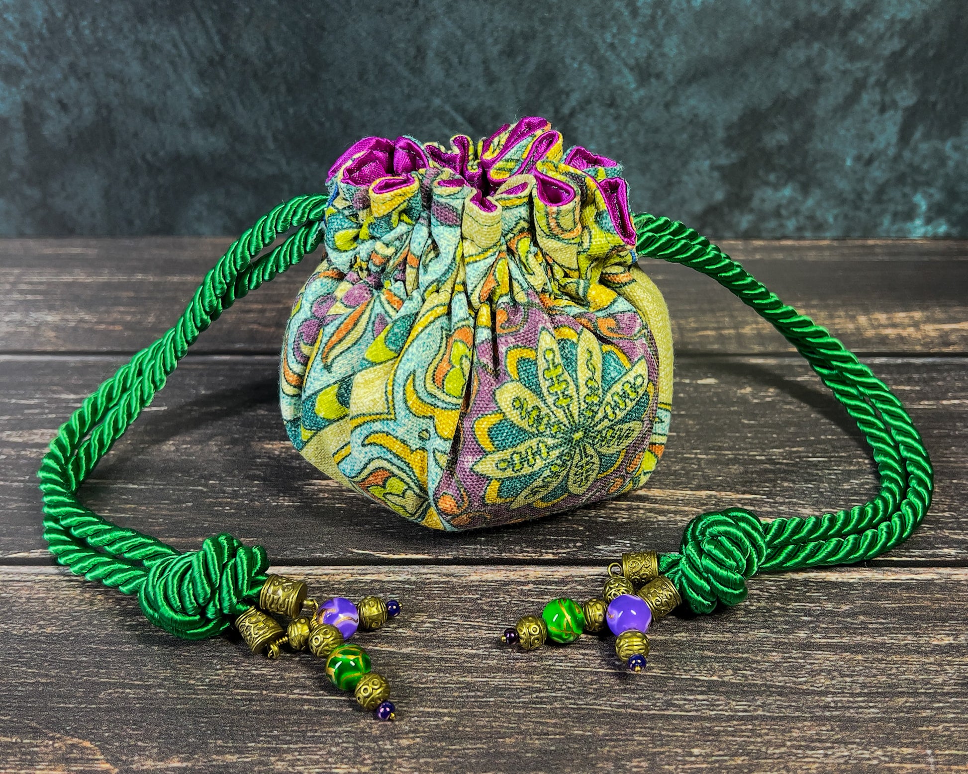 Designed with segmented interior pockets and a wide mouth opening, our bags are ideal for holding table-top gaming dice (for Dungeons and Dragons, Pathfinder, etc.) or as bags for jewelry, crystals, coins and more. The double drawstring cord closure holds the bag secure when closed. When open, internal reinforcements in the construction process help the bag to keep its shape. An additional flexible insert sewn into the base of the bag also helps it to sit flat on a table and can double as a dice rolling surface.