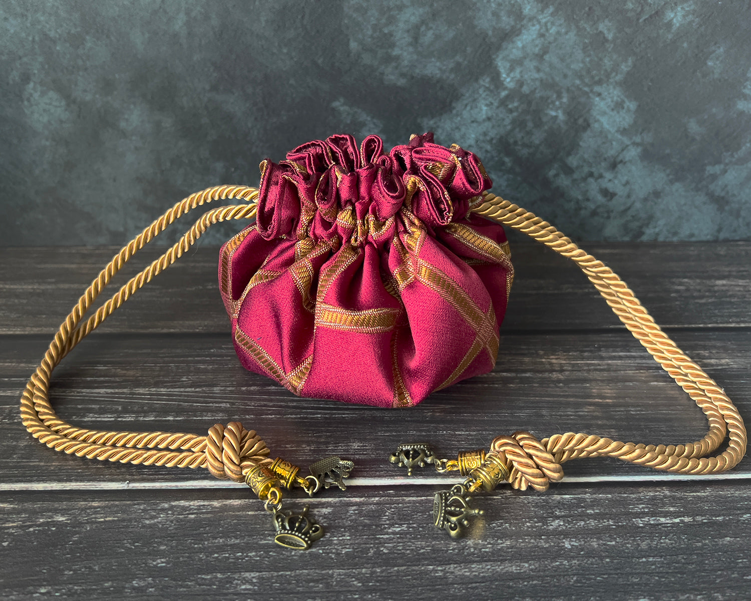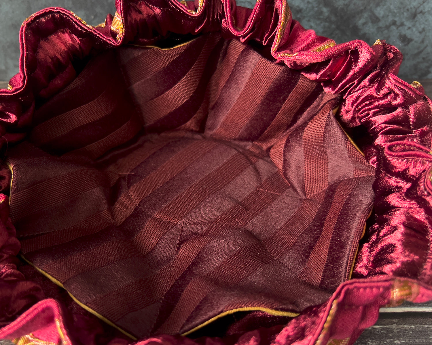 The Nobility Bag owns its namesake down to every detail. Part of a long lineage, both the red exterior fabric striped with gold and the ruby red satin lining are vintage. For the pockets a two-tone red stripe stands proudly facing out while a subtle gold is hidden within where treasures would naturally be kept. Standing proud are golden bronze crown charms at the end of each drawstring cord.