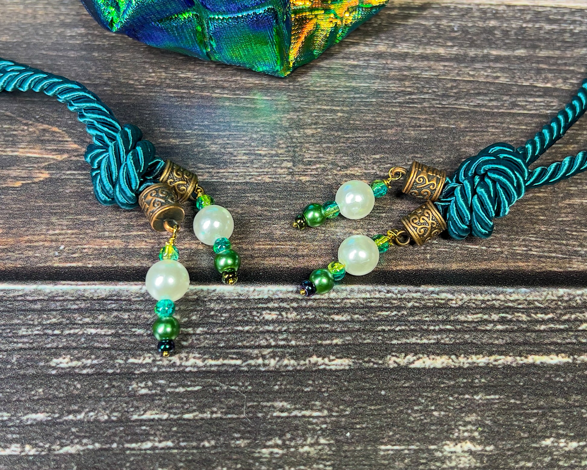 - ACCENT CHARMS - white and green faux pearls and green glass beads.
