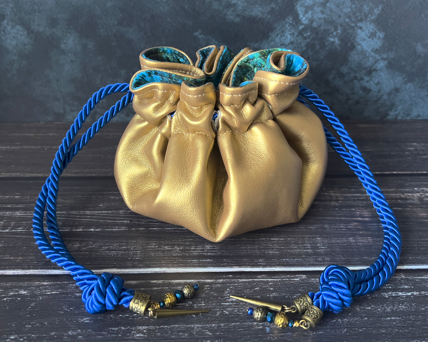 Designed with segmented interior pockets and a wide mouth opening, our bags are ideal for holding table-top gaming dice (for Dungeons and Dragons, Pathfinder, etc.) or as bags for jewelry, crystals, coins and more. The double drawstring cord closure holds the bag secure when closed. When open, internal reinforcements in the construction process help the bag to keep its shape. An additional flexible insert sewn into the base of the bag also helps it to sit flat on a table and can double as a dice rolling surface.