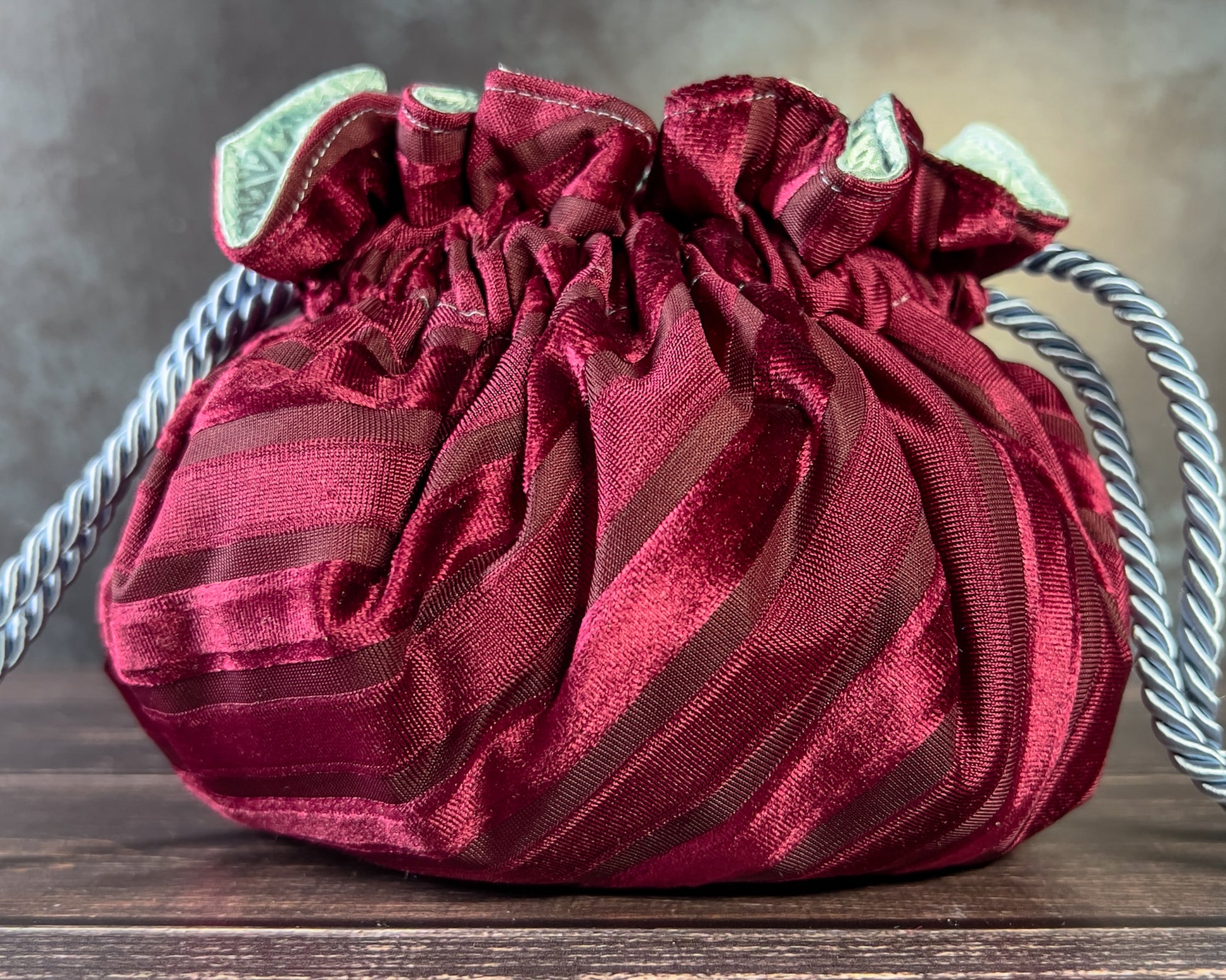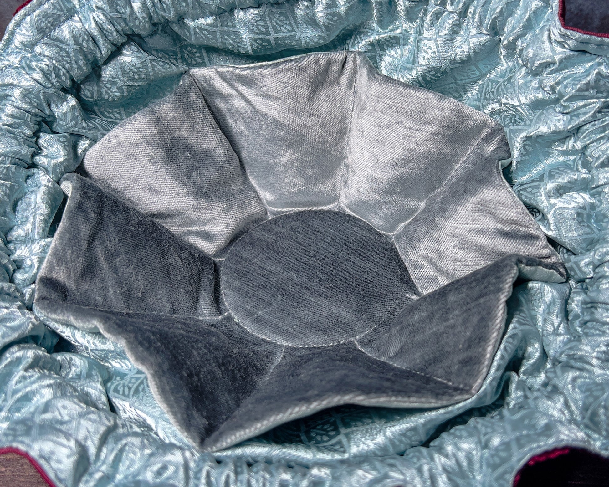 Designed with segmented interior pockets and a wide mouth opening, our bags are ideal for holding table-top gaming dice (for Dungeons and Dragons, Pathfinder, etc.) or as bags for jewelry, crystals, coins and more. The double drawstring cord closure holds the bag secure when closed. When open, internal reinforcements in the construction process help the bag to keep its shape. An additional flexible insert sewn into the base of the bag also helps it to sit flat on a table and can double as a dice rolling surface.