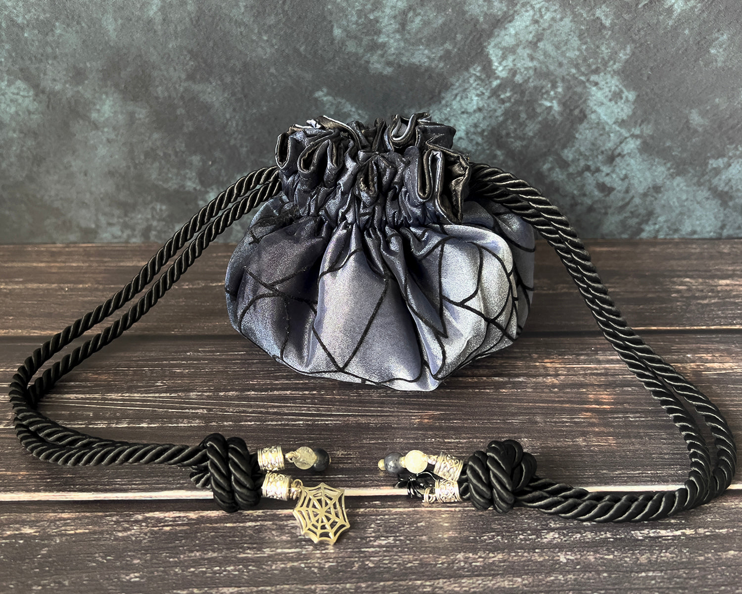 Waiting along the pattern of a velvet web on translucent silver organza, The Weaver Bag spins its story. The shimmering black satin lining and foil web-patterned pockets work together to draw in the prey. Before you know it you are caught, held firm with two drawstrings, one of which is adorned with a silver spider’s web charm. On the other, the hungry spider waits…