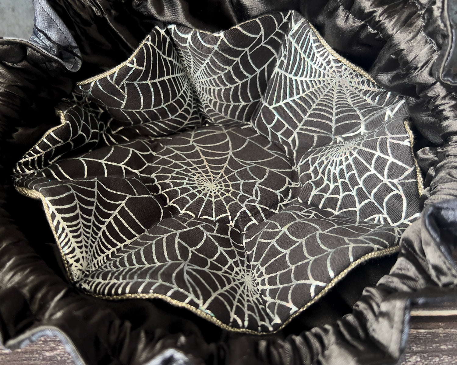 - FABRIC - Exterior: Silver Organza with a velvet spider web pattern layered over black cotton. Interior: Black Satin. Pockets: cotton jersey with silver foil web pattern exterior with interior in silver weave.