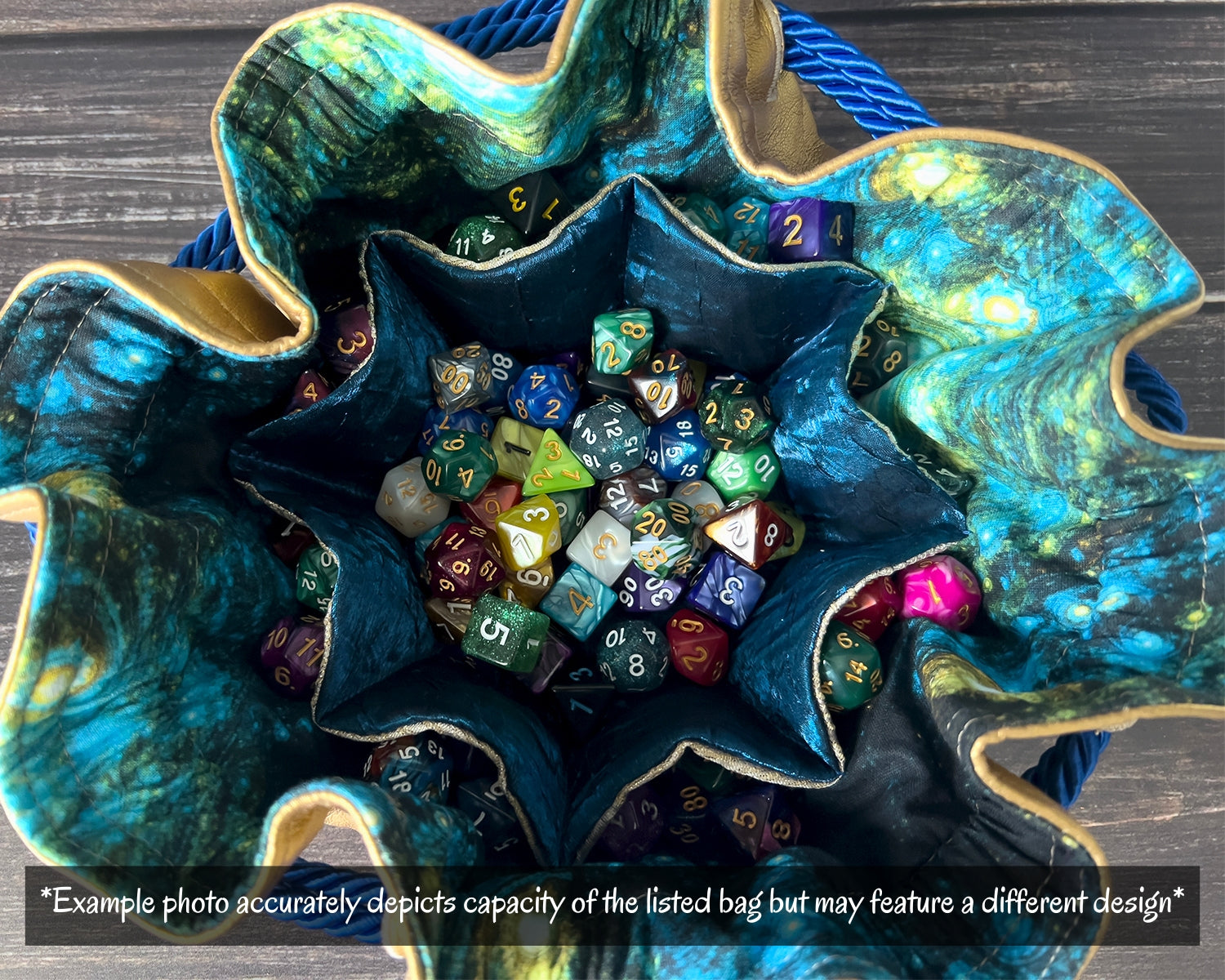 Designed with segmented interior pockets and a wide mouth opening, our bags are ideal for holding table-top gaming dice (for Dungeons and Dragons, Pathfinder, etc.) or as bags for jewelry, crystals, coins and more. The double drawstring cord closure holds the bag secure when closed. When open, internal reinforcements in the construction process help the bag to keep its shape. An additional flexible insert sewn into the base of the bag also helps it to sit flat on a table and can double as a dice rolling surface.