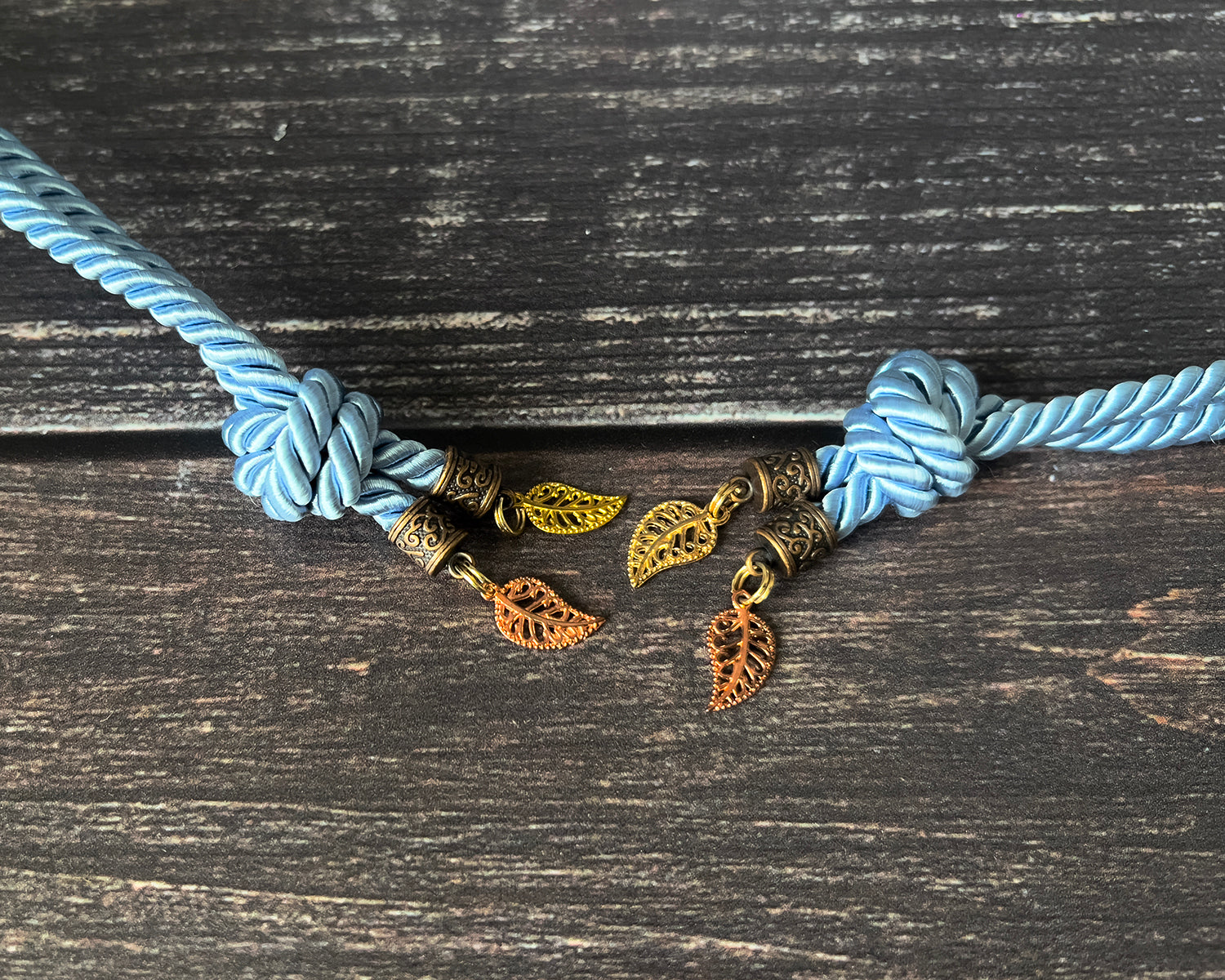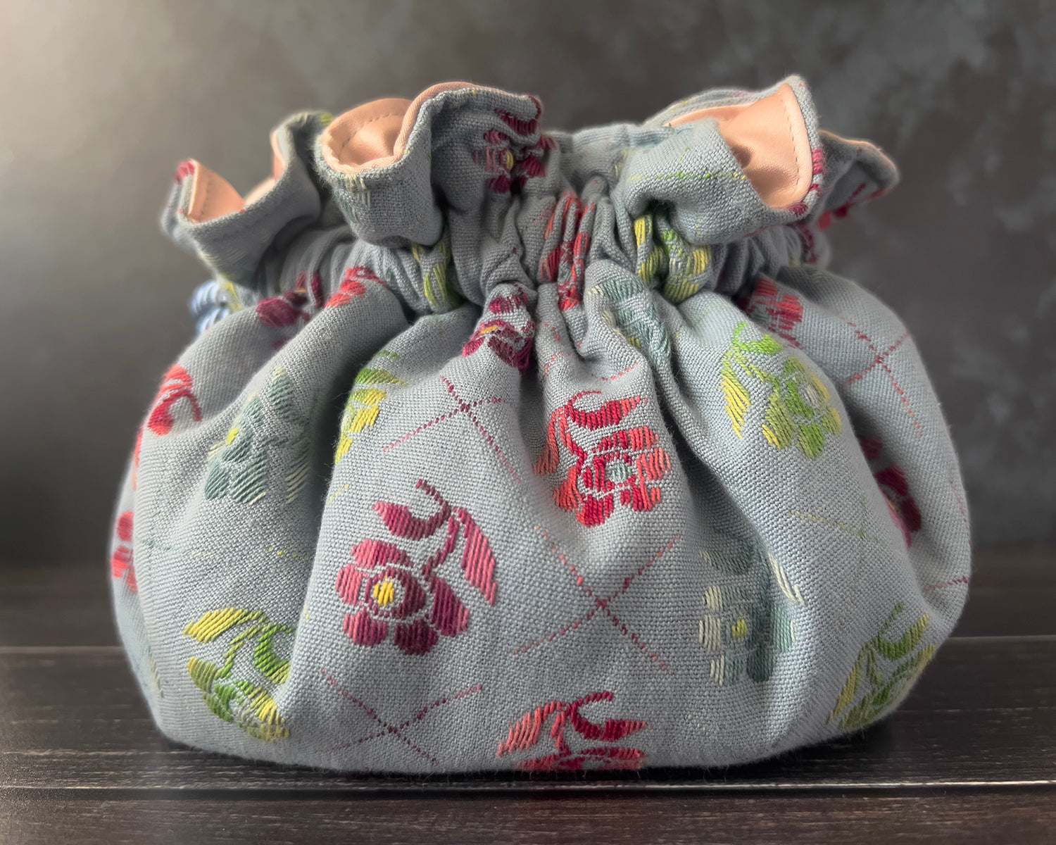 The elegance of the courtly lady meets timeless style with our Tudor Rose Bag. Muted blue on the exterior with flowers woven through the fabric evokes an embroidery pastime. The interior of the bag features a soft pink sateen and an explosion of flowers on the pockets made with vintage cotton. The bag is finished off with a sky blue drawstring cord and metal lacework leaf charms.